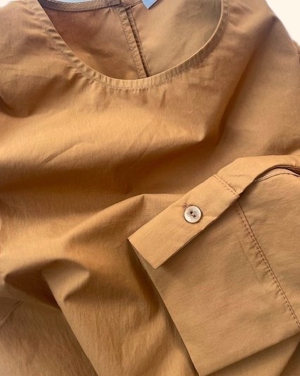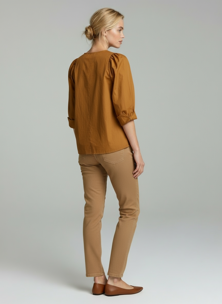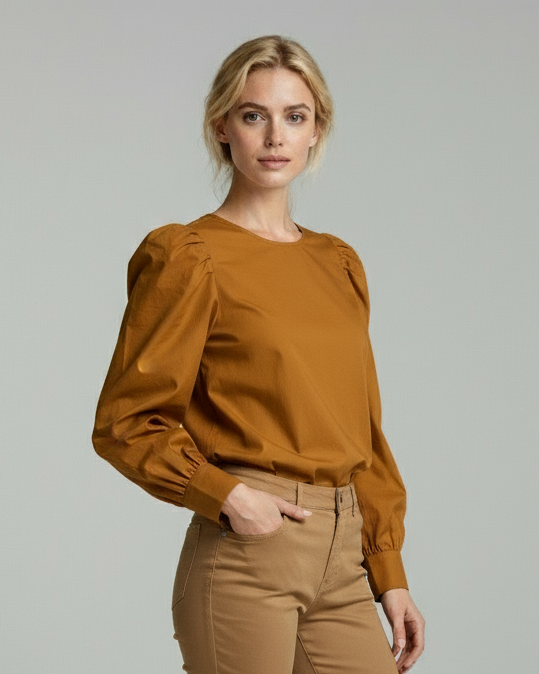 Die Bluse Amrei in einem warmen und edlen Cognacton ist aus fein gewebter Baumwolle hergestellt. Somit bietet sie hohen Tragekomfort und ein luxuriöses Gefühl auf der Haut. Der Rundhalsausschnitt verleiht der Bluse eine klassische Note und die bis knapp zur Hüfte reichende Länge schafft eine chice Silhouette. Die langen, angerüschten Ärmeln sind ein besonderes Highlight und enden in 6 cm breiten Manschetten. Ein kleiner Schlitz mit Knopfverschluss am Rücken rundet das Design ab. Alles in allem – eine Bluse für einen stilvollen und entspannten Look.