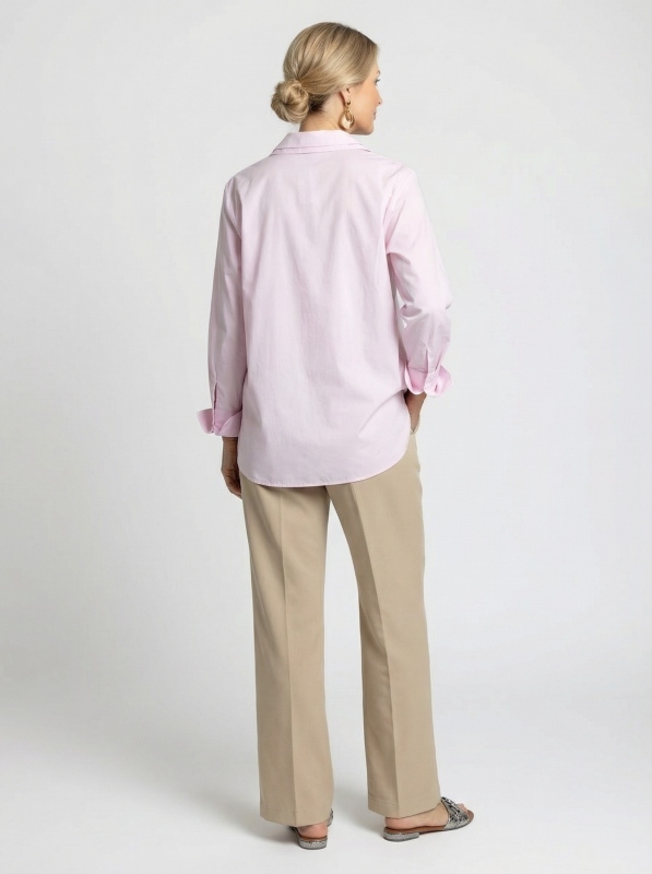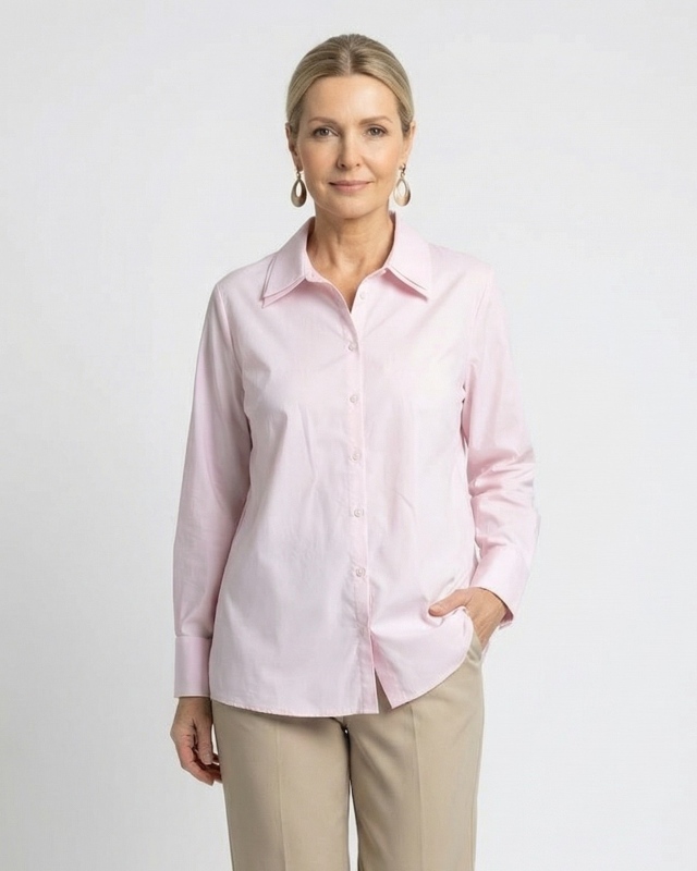 Zwei seitlich eingearbeitete Taschen fügen sich unauffällig ein und verleihen der Bluse eine moderne, entspannte Note. Der hochwertige Baumwoll-Polyester-Mix mit Stretchanteil fühlt sich angenehm auf der Haut an, ist formstabil und alltagstauglich.