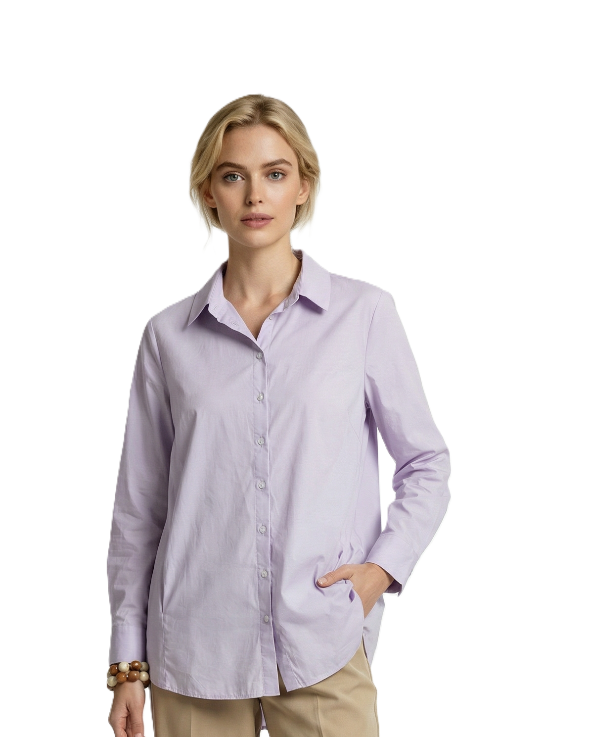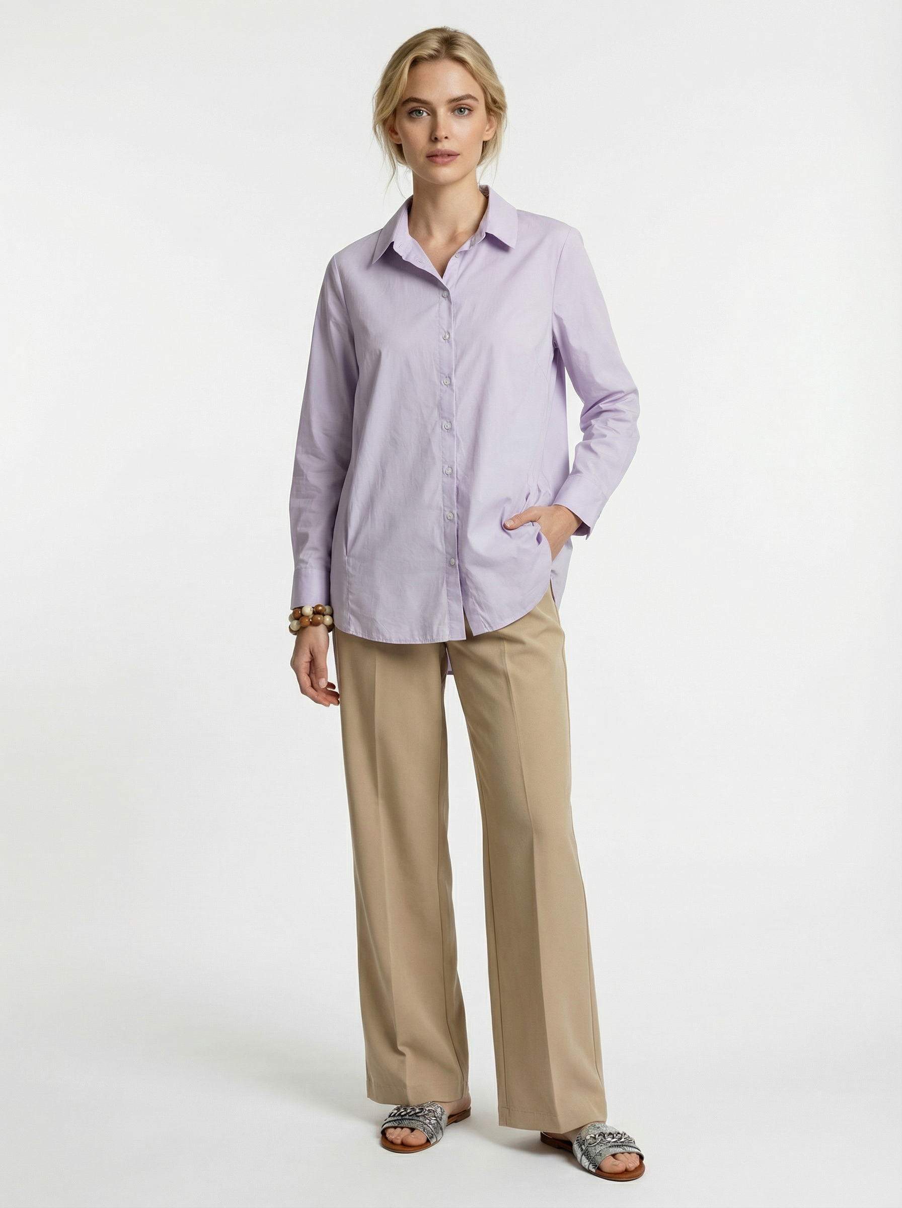 Mit ihrem Kentkragen, durchgeknöpftem Vorderteil und den zwei seitlichen Eingrifftaschen vereint die Bluse Hanna in flieder Eleganz und Funktionalität. Die Dreiviertelärmel mit breitem Umschlag verleihen der Bluse einen modernen Touch und der hinten länger geschnittene und abgerundete Saum sorgt für eine schmeichelhafte Silhouette. Die hüftlange Passform macht die Bluse Hanna ideal für verschiedenen Anlässse. Dieses Design ermöglicht es die Bluse sowohl lässig als auch chic zu kombinieren.