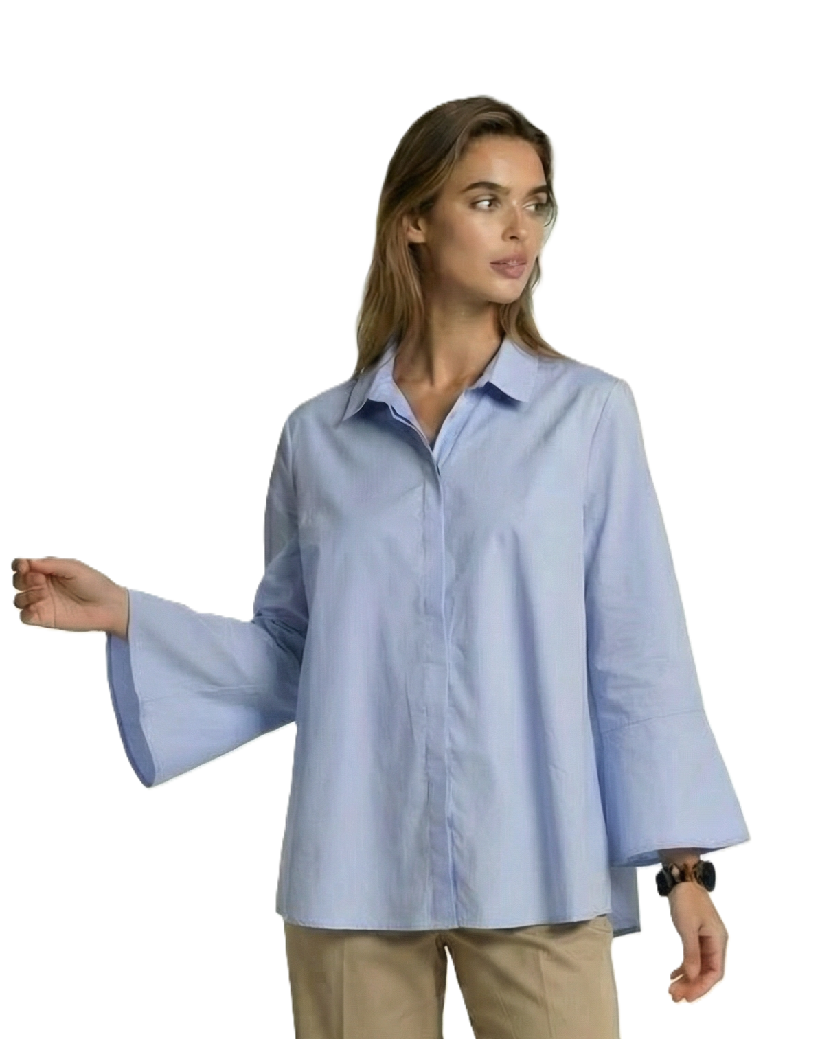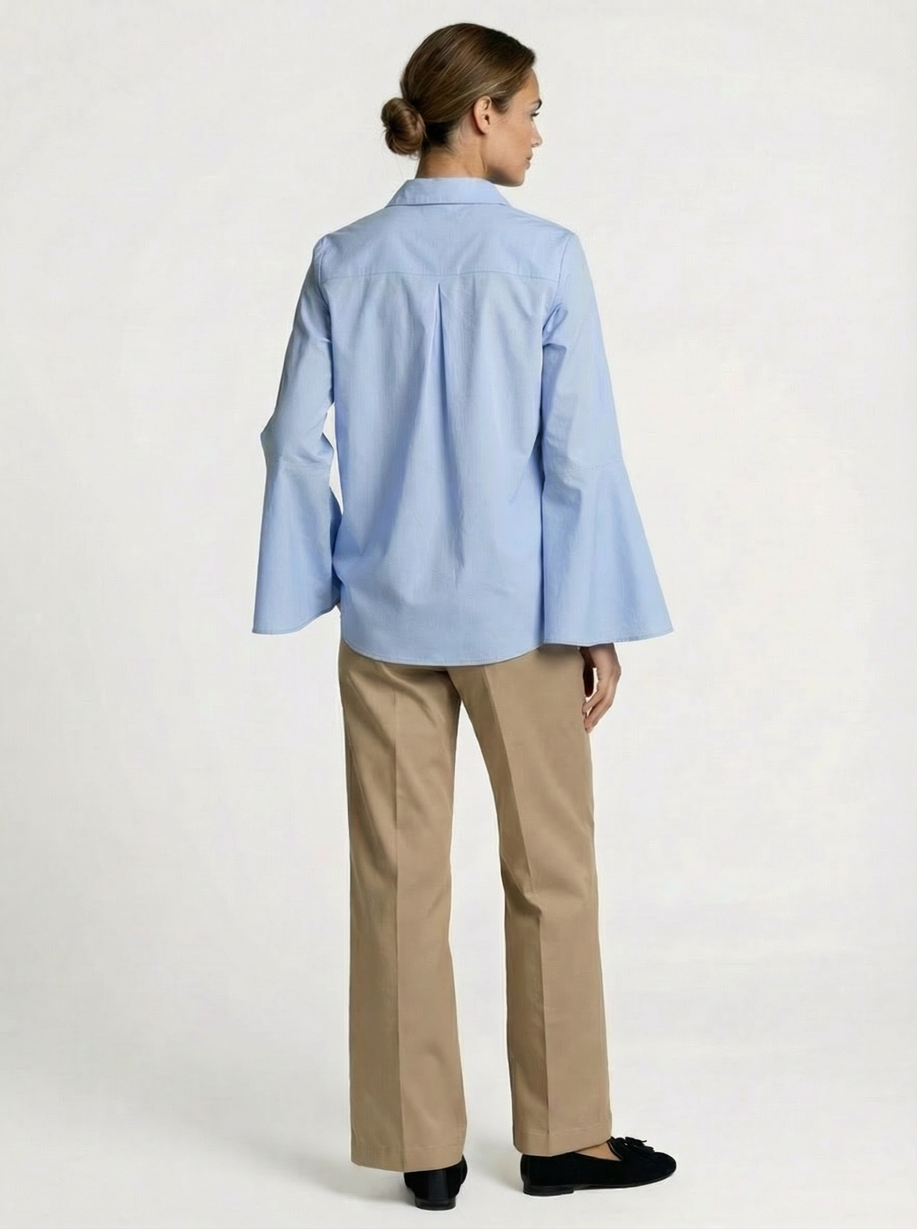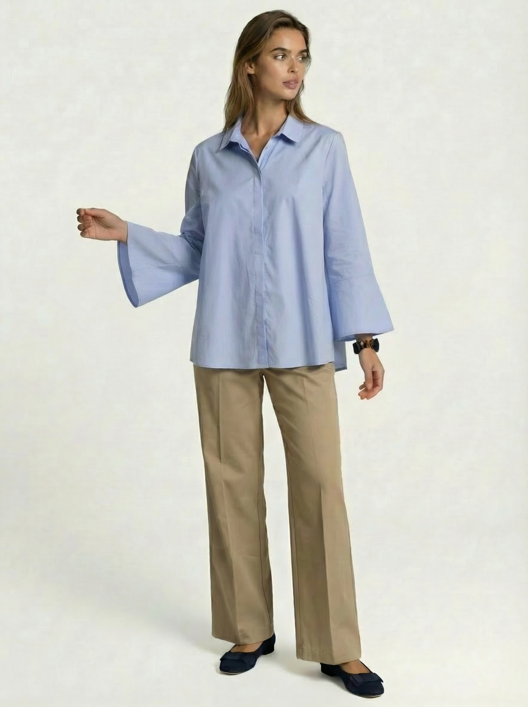 Der etwas weiter ausgeschnittene Kentkragen verleiht der Bluse eine elegante Offenheit und unterscheidet sie subtil von der klassischen Hemdbluse. Die verdeckte Knopfleiste unterstreicht den puristischen Anspruch, während die Trompetenärmel einen femininen Akzent setzen.