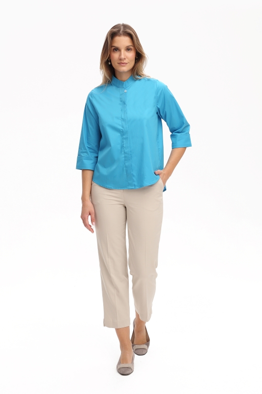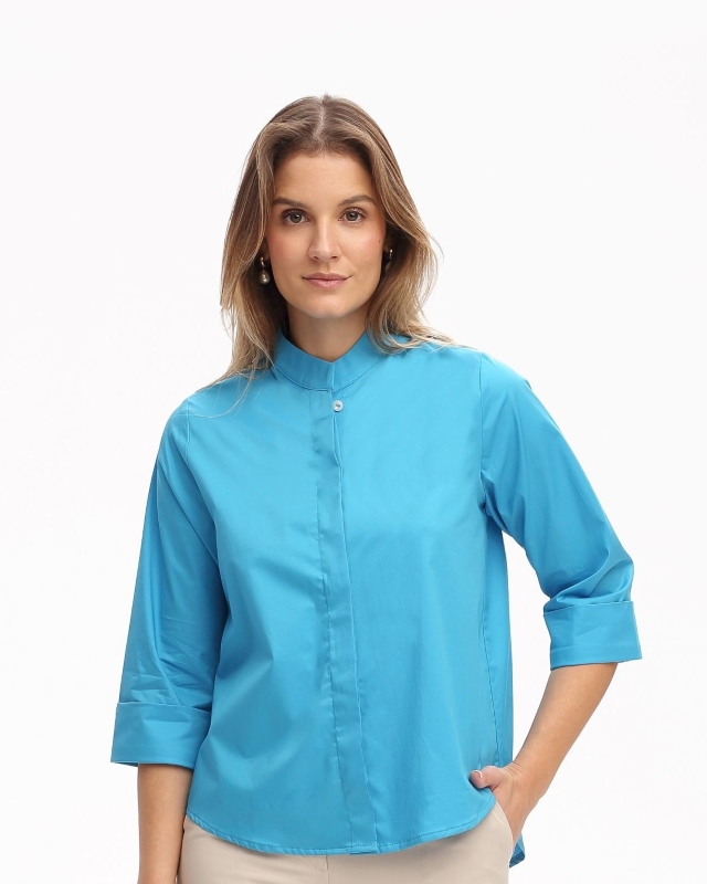 Die Bluse Iris ist ein vielseitiges Kleidungsstück, das durch ihre durchgeknüpfte Front und den eleganten Stehkragen besticht. Die Bluse ist sowohl vorne als auch hinten abgerundet, wobei der hintere Teil länger geschnitten ist und bis zur Hüfte reicht. Diese Merkmale verleihen der Bluse eine moderne Silhouette und machen sie vielseitig kombinierbar. Die Dreiviertelärmel sind mit einem breiten Umschlag versehen, der über den Ellbogen reicht und der Bluse einen zusätzlichen chicen Akzent verleiht. Die Bluse eignet sich sehr gut für sowohl legere als auch formellere Anlässe und ergänzt wunderbar Ihre Garderobe Die strahlende Farbe ozean macht sofort gute Sommerlaune.