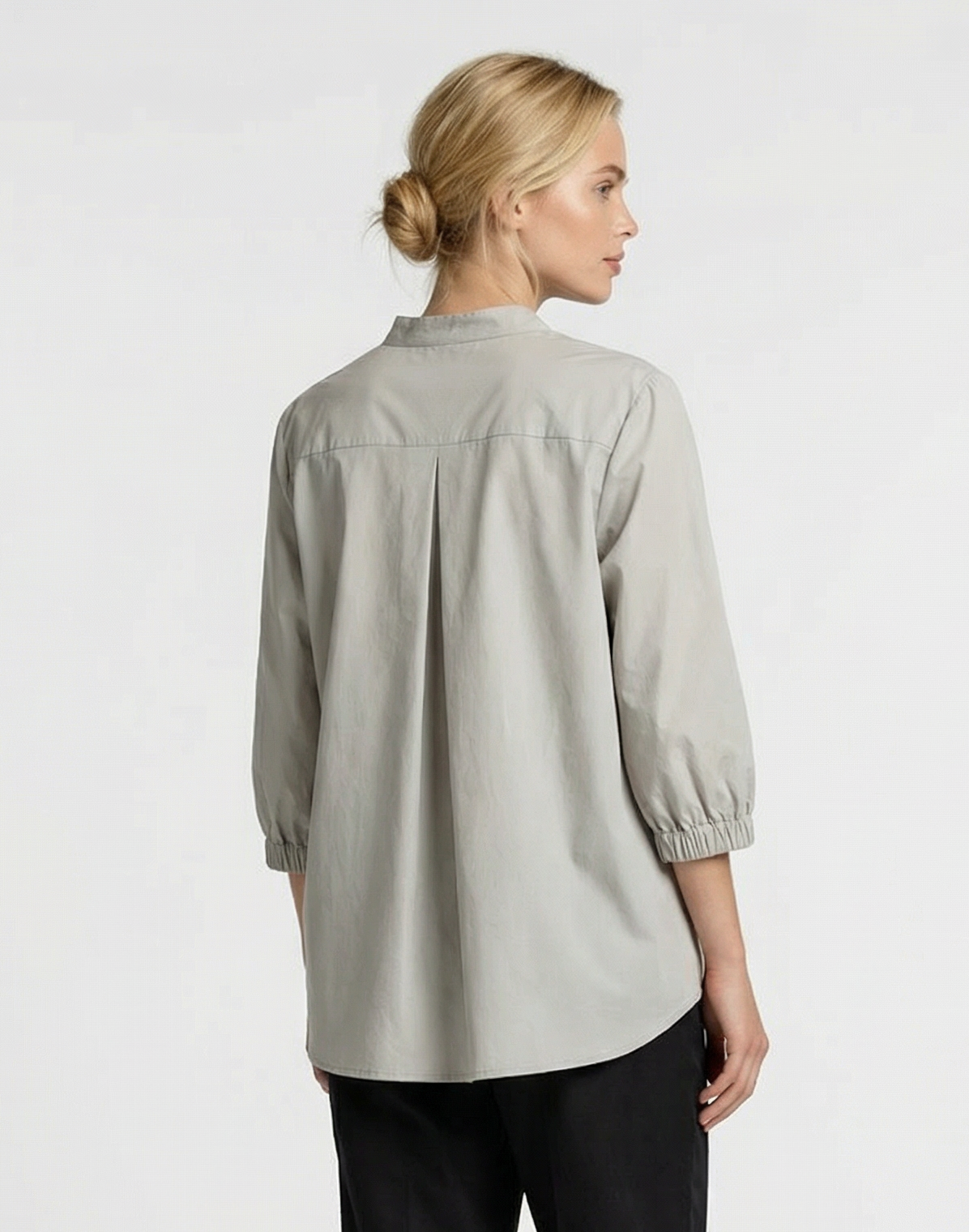 Der weite Schnitt in Kombination mit der großzügig eingearbeiteten Falte im Rückenteil sorgt für einen schönen Fall und hohen Tragekomfort. Die Bluse überdeckt am Vorderteil die Taille und reicht am Rücken fast bis zur Hüfte, dadurch lässt sich die Bluse besonders harmonisch zu weiten Hosen kombinieren – perfekt für einen modernen, stilvollen Look.