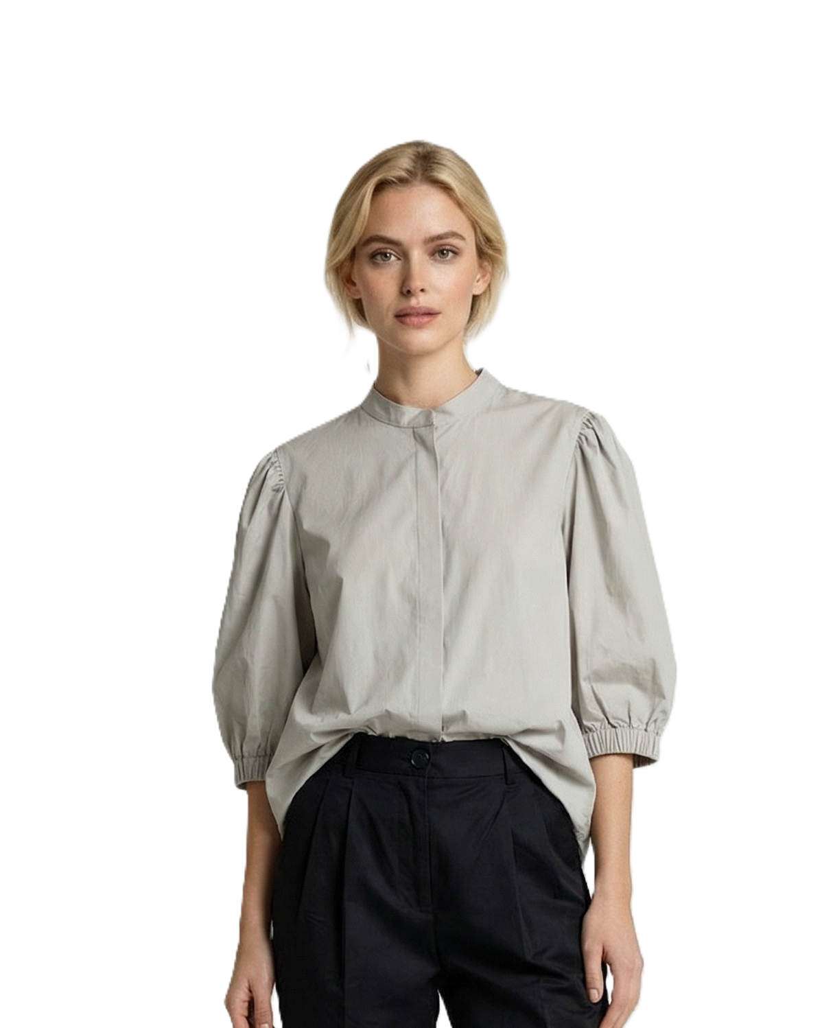 Diese chice Bluse überzeugt durch ihre hochwertige Materialqualität und eine moderne, lässige Silhouette. Die Baumwollmischung mit Elasthan sorgt für ein angenehmes Tragegefühl und optimale Bewegungsfreiheit – ideal für den ganzen Tag. Die verdeckte Knopfleiste auf der Vorderseite verleiht der Bluse eine besonders elegante Optik. Ein kleiner Stehkragen setzt einen zeitlosen Akzent. Die kurzen, weiten Ärmel reichen bis zum Ellbogen und schließen mit einem Gummizug ab, wodurch eine lockere, feminine Form entsteht.
