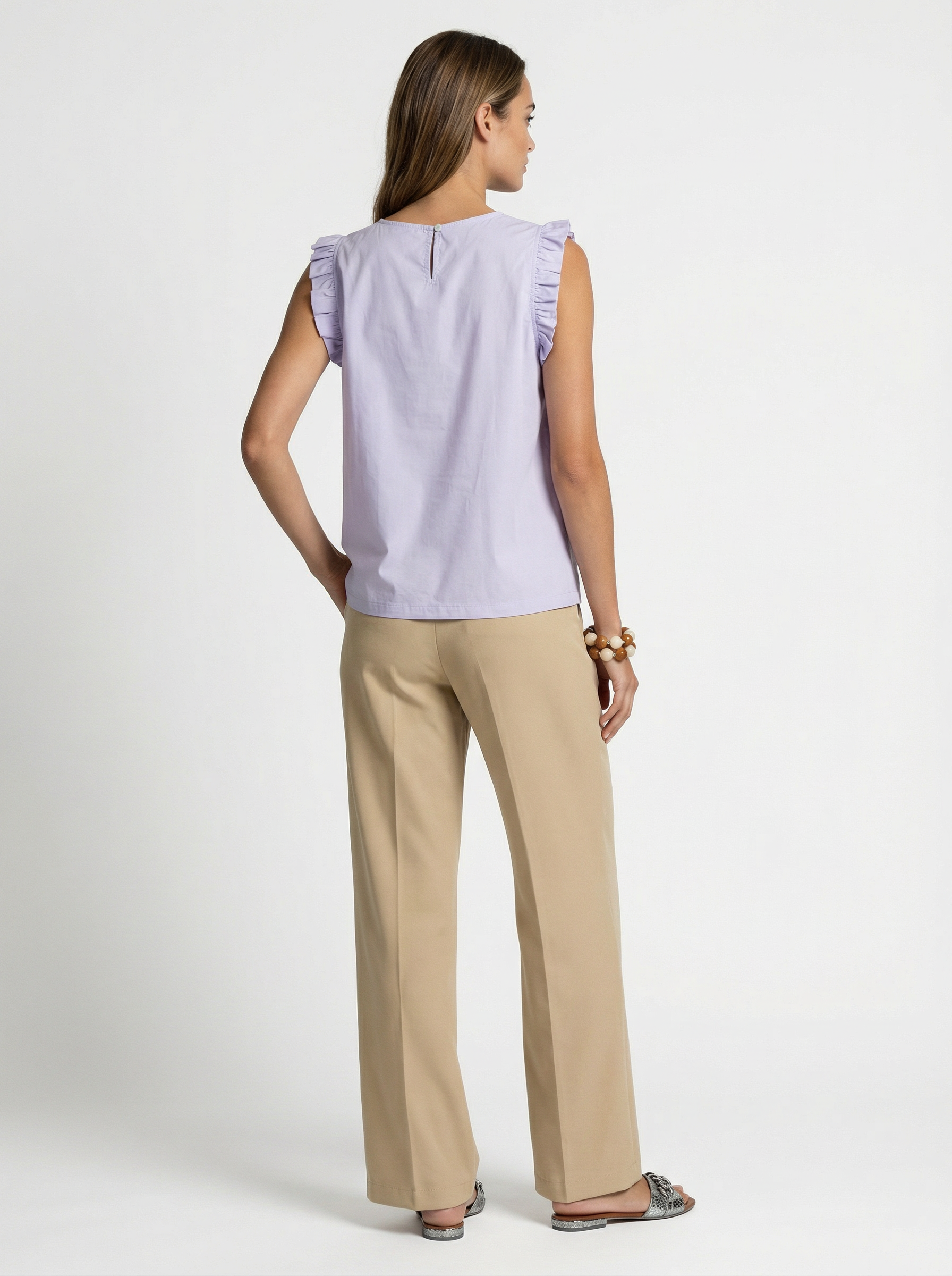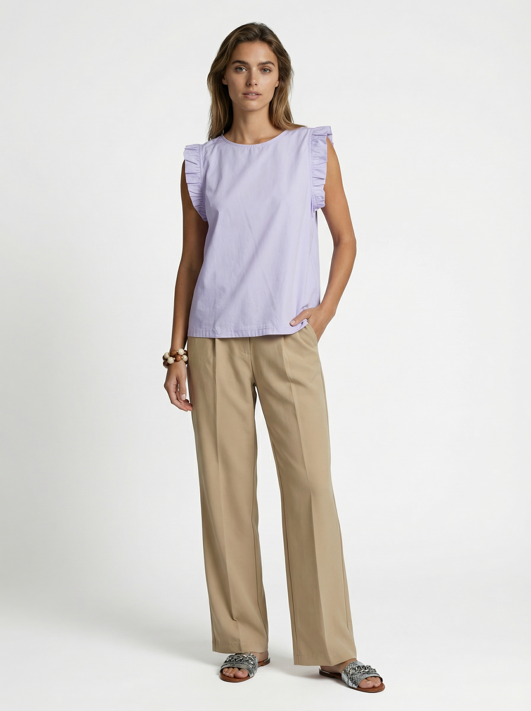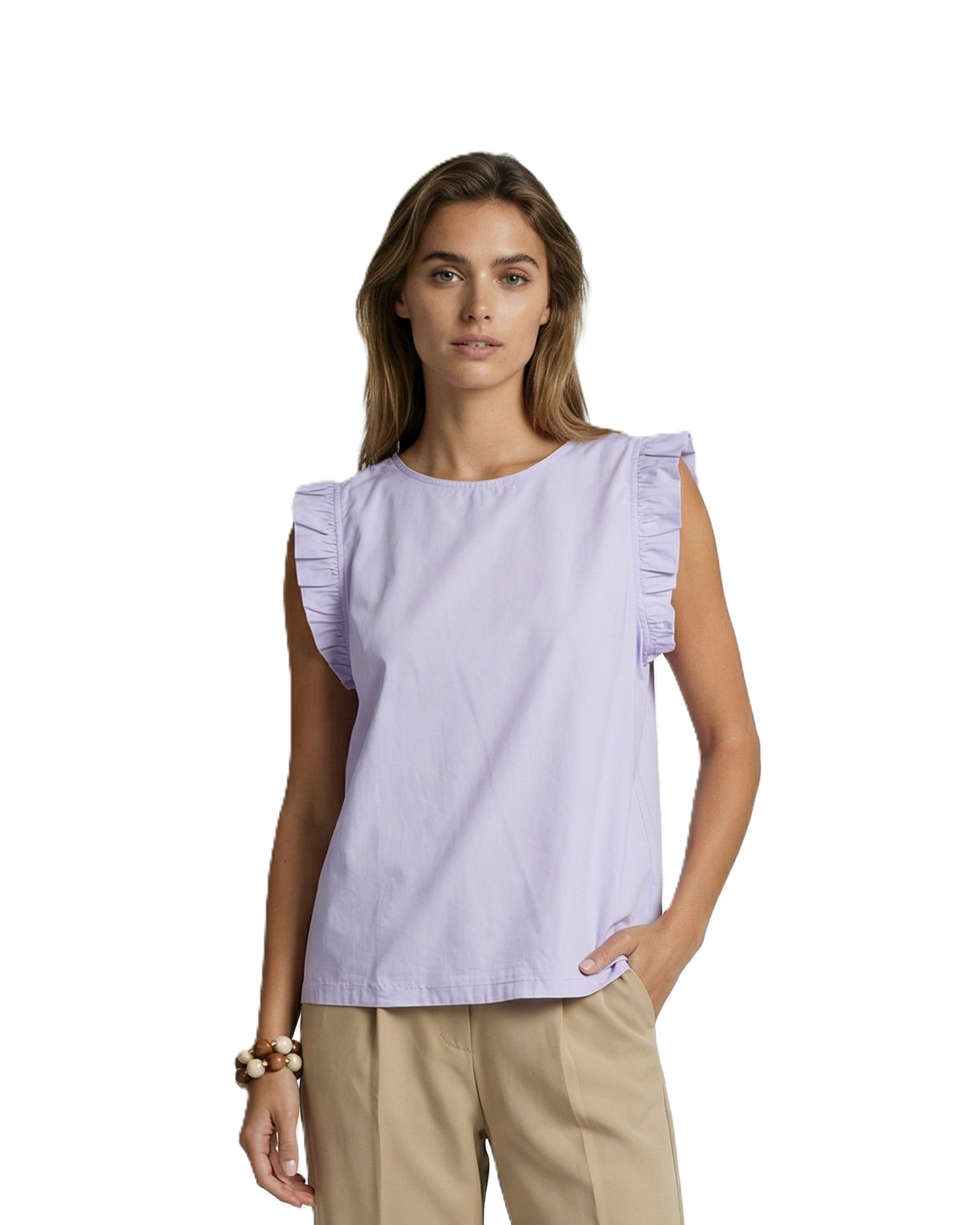 Der klassische Rundhalsausschnitt wird am Rücken durch einen kleinen Schlitz mit Knopfverschluss ergänzt, der der sommerlichen Bluse eine feine, feminine Note verleiht. Die ärmellose Silhouette wird durch dekorative Rüschen am Ärmelausschnitt stilvoll akzentuiert und sorgt für einen besonderen Blickfang.