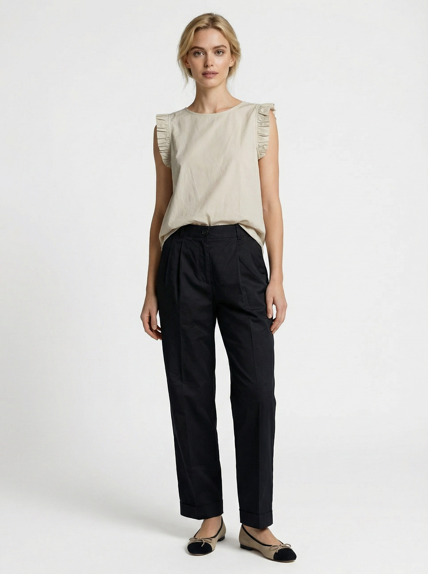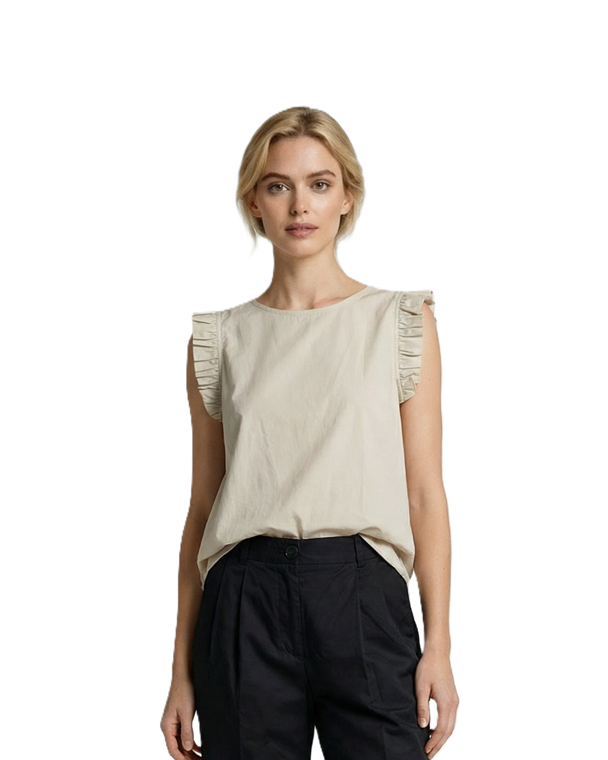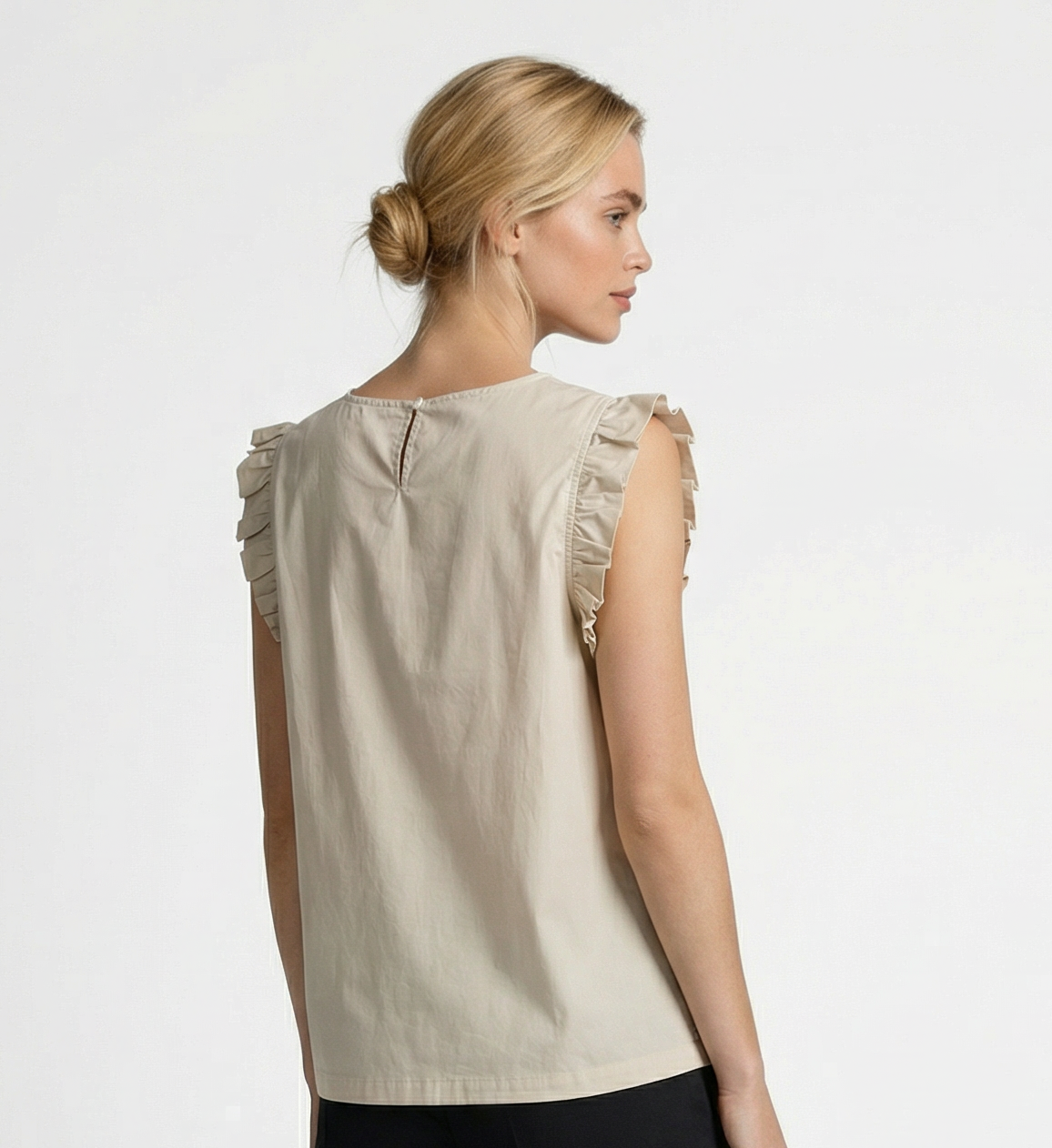 Der klassische Rundhalsausschnitt wird am Rücken durch einen kleinen Schlitz mit Knopfverschluss ergänzt, der der sommerlichen Bluse eine feine, feminine Note verleiht. Die ärmellose Silhouette wird durch dekorative Rüschen am Ärmelausschnitt stilvoll akzentuiert und sorgt für einen besonderen Blickfang.