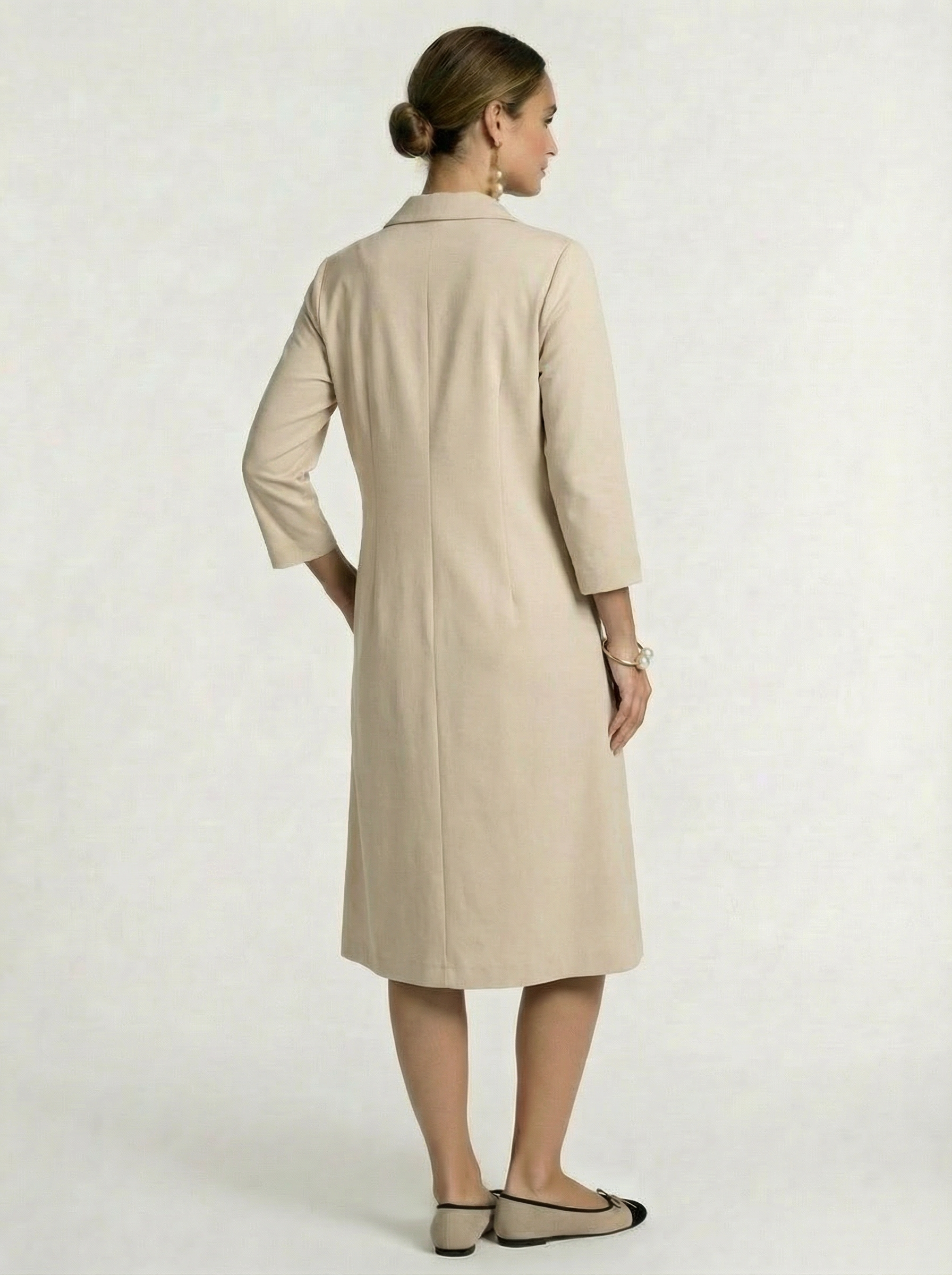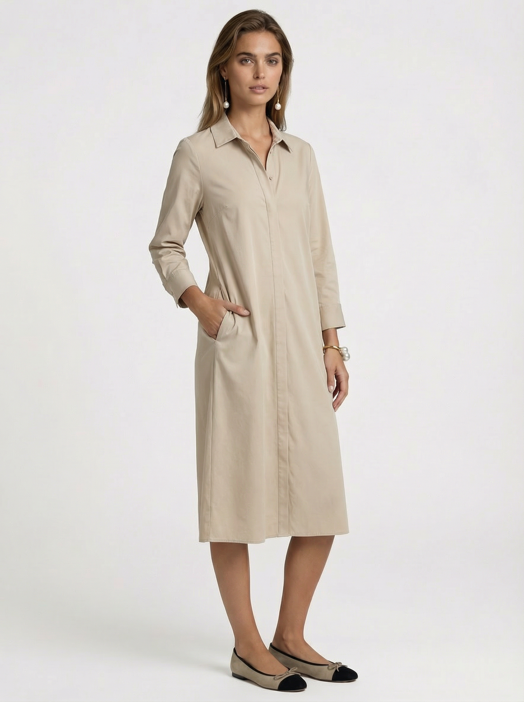 Der Rücken ist leicht tailliert gearbeitet, sodass eine feminine Silhouette entsteht, ohne einzuengen. Zwei seitlich eingearbeitete Taschen machen das Kleid besonders praktisch und unterstreichen seinen unkomplizierten Charakter. Die Dreiviertelärmel mit Manschette und kleinem Schlitz sorgen für eine gepflegte Optik und angenehme Beweglichkeit.