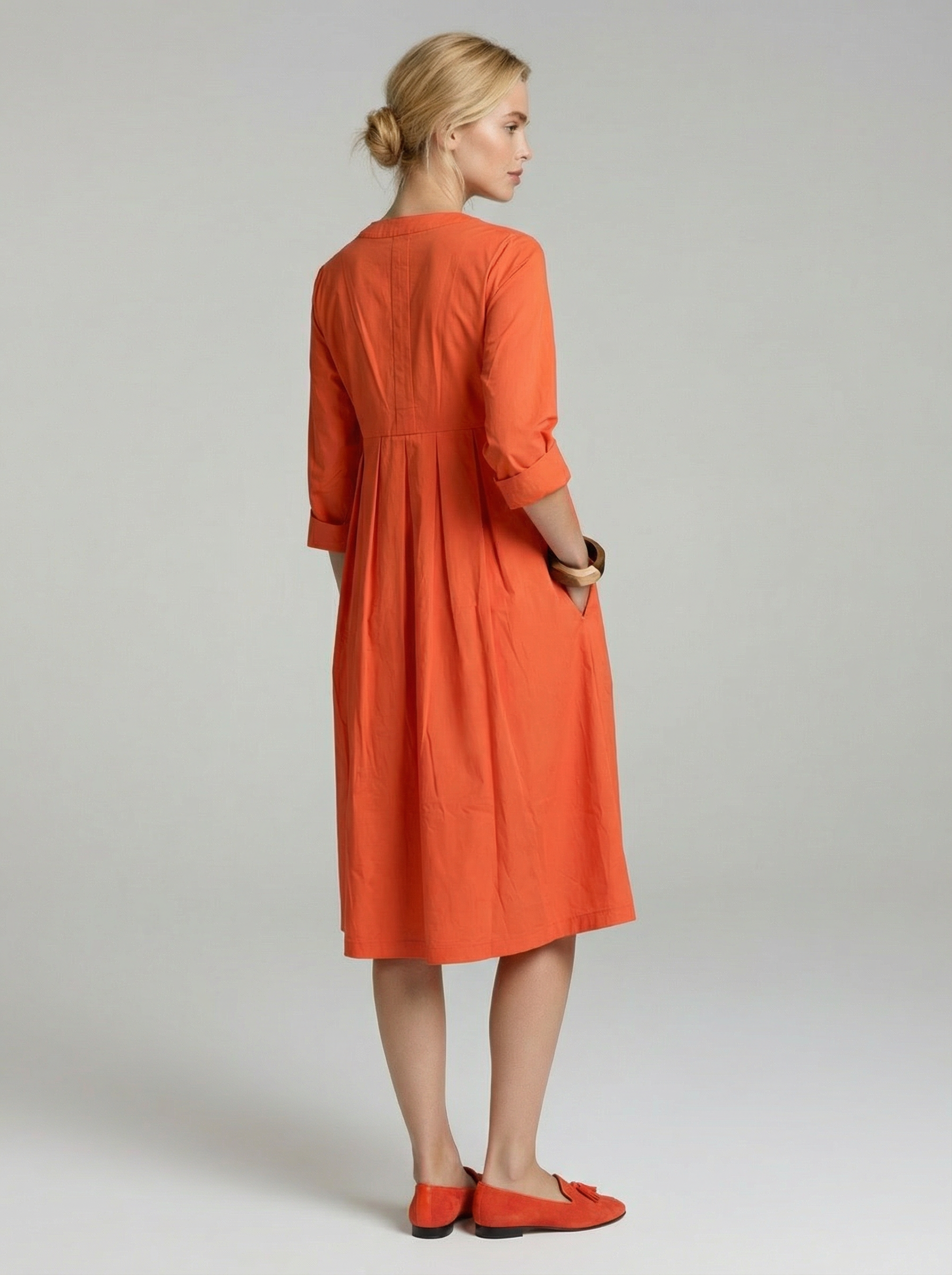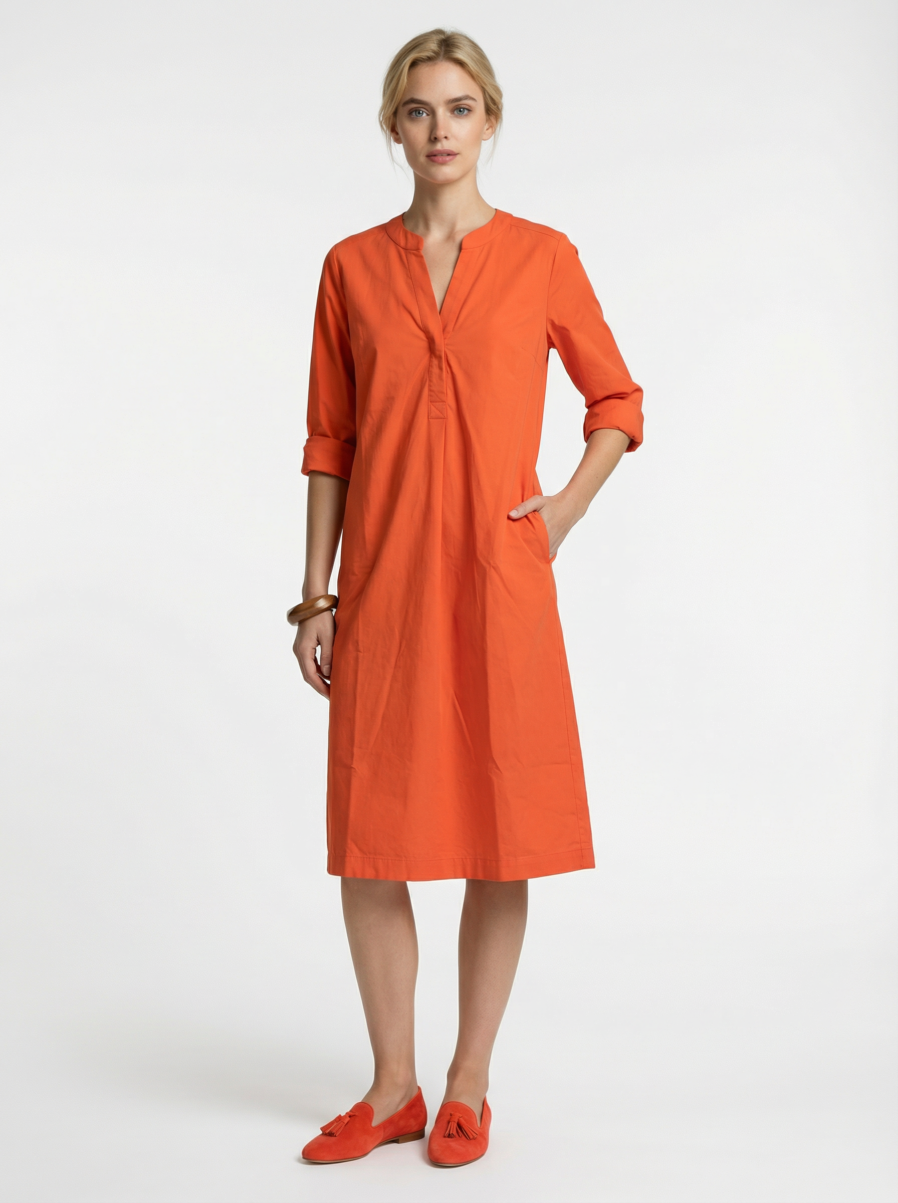 Drei seitlich eingearbeitete Taschen fügen praktische Funktionalität hinzu, dezent integriert in das Design. Die langen Ärmel lassen sich im Sommer je nach Bedarf lässig krempeln und unterstreichen den unkomplizierten Charakter des Modells. Die Länge reicht über die Knie und wirkt dadurch modern und leicht.