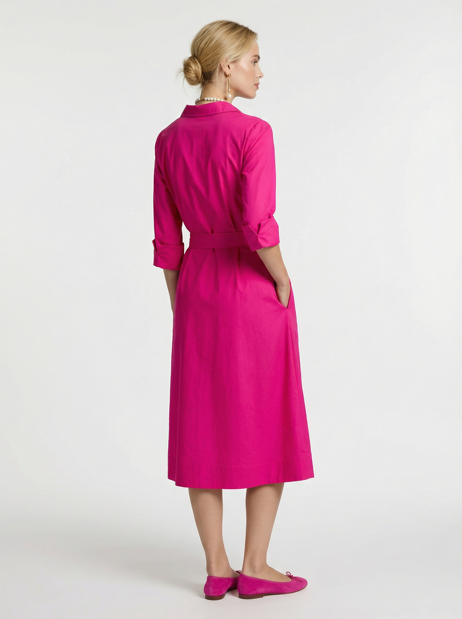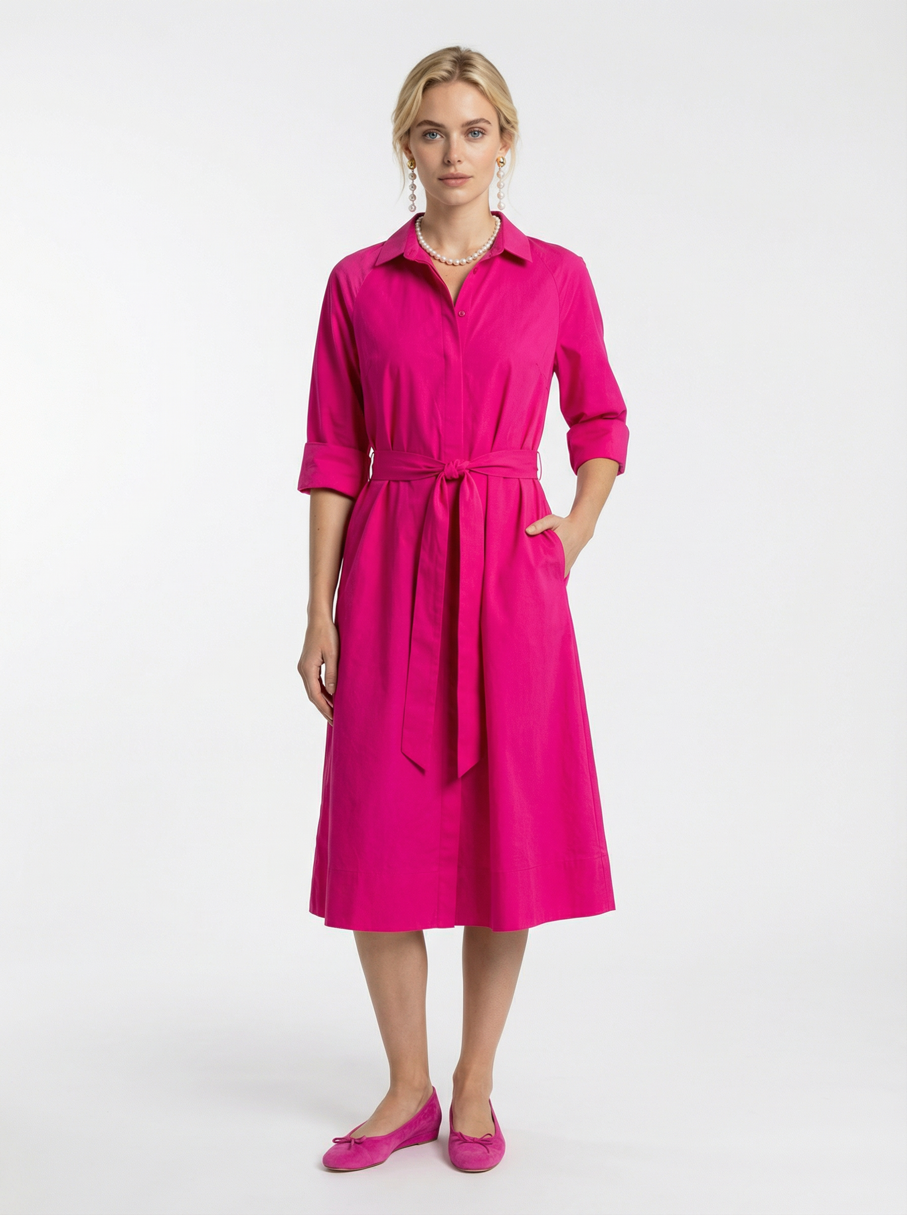 Der klassische Kentkragen und die durchgehende, verdeckte Knopfleiste unterstreichen den zeitlosen Charakter des Designs. Lange Ärmel mit breiter Manschette setzen einen eleganten Akzent und lassen sich je nach Anlass stilvoll variieren. Zwei seitlich eingearbeitete Taschen bieten praktischen Komfort im Alltag. Die wadenlange Silhouette wirkt ruhig und souverän, der Bindegürtel ermöglicht es, die Taille individuell zu betonen oder das Kleid locker fallend zu tragen. Ein Kleid, das vom Vormittag an mühelos durch den ganzen Tag begleitet – klassisch, stilvoll und nie aus der Mode. Ein unentbehrliches Teil in der Garderobe jeder Frau.