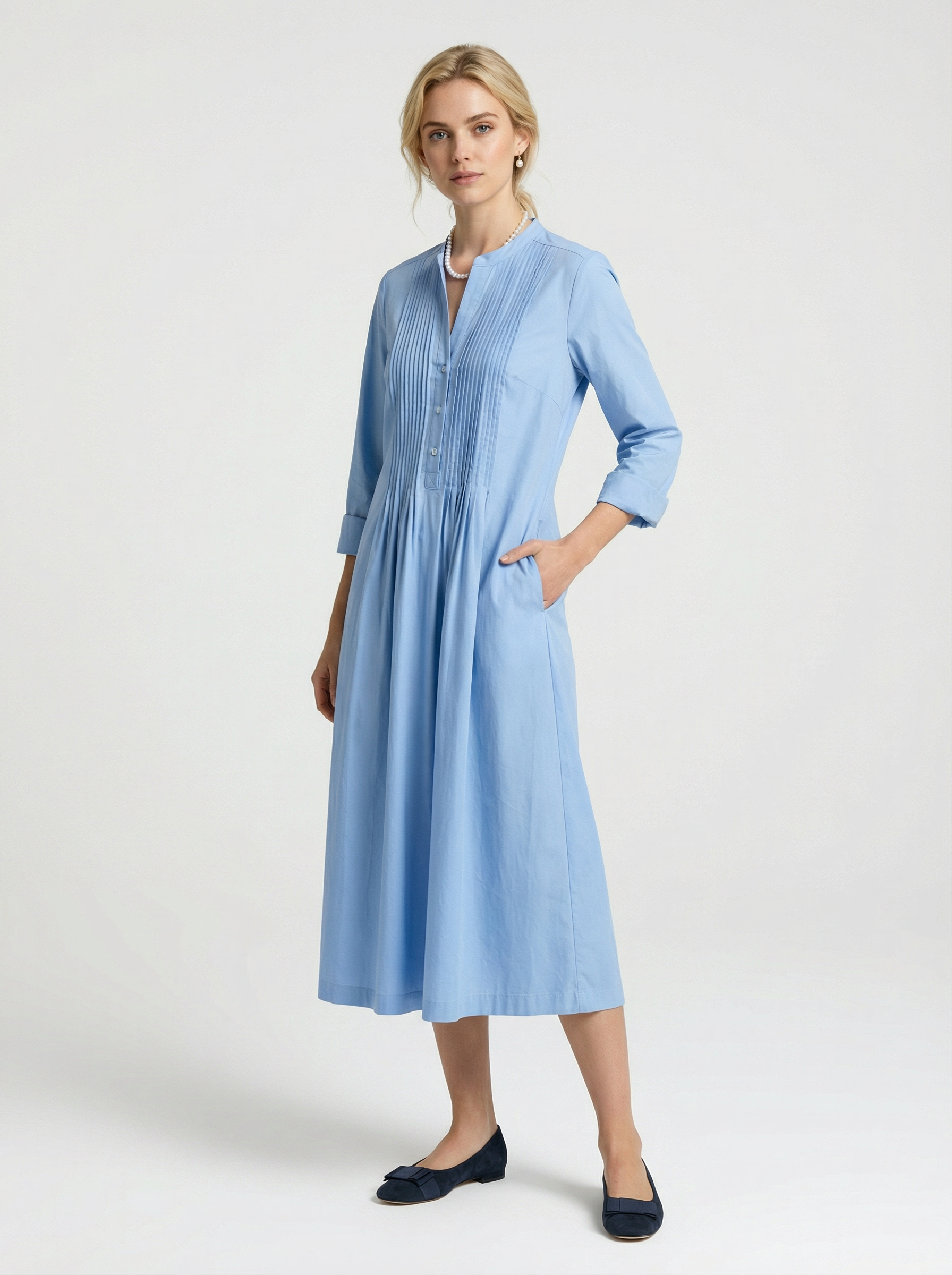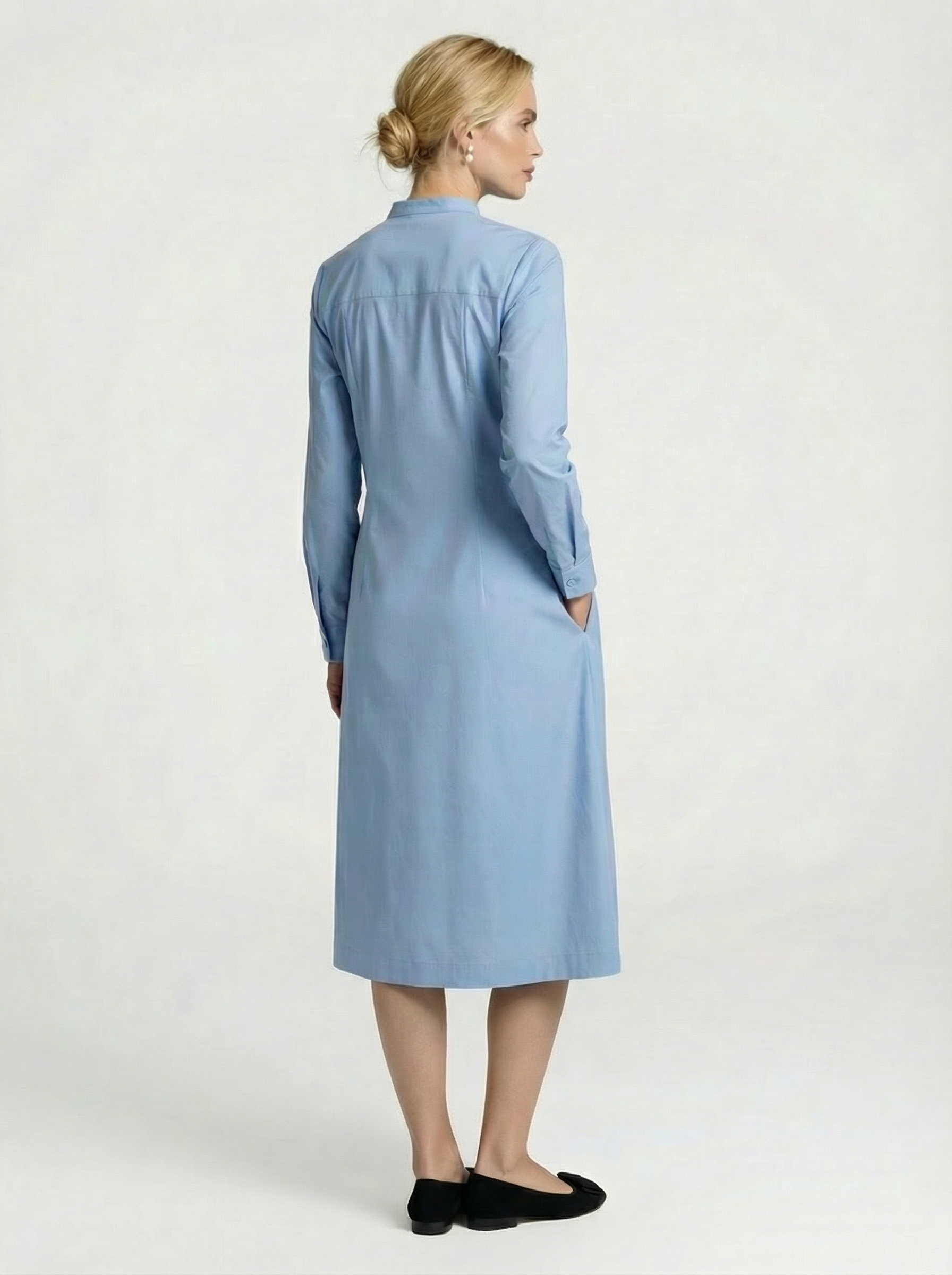 Dieses feminine Kleid überzeugt durch seine klare Linie und feine Details. Gefertigt aus hochwertiger Baumwolle mit einem dezenten Elasthananteil, trägt es sich angenehm leicht und bietet zugleich komfortable Bewegungsfreiheit. Der Rundhalsausschnitt mit kleinem Stehkragen verleiht dem Design eine moderne, zurückhaltende Eleganz. Auf der Vorderseite sind bis zur Taille feine Biesen eingearbeitet – sie sorgen für Weite, ohne aufzutragen, und unterstreichen die fließende Silhouette. Die Rückseite ist bewusst glatt gearbeitet und bringt Ruhe in das Gesamtbild. Lange Ärmel mit ca. 5 cm Umschlag und dezentem Schlitz lassen sich unkompliziert krempeln und machen das Kleid vielseitig tragbar. Zwei unauffällig eingearbeitete Taschen bieten zusätzlichen Komfort. Die gut überknielange Länge rundet den femininen, zeitlosen Look ab.