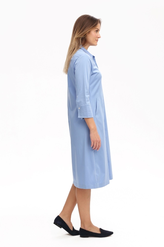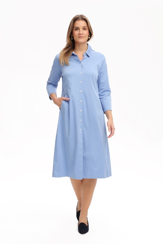 Das Kleid Sabine ist ein elegantes Tageskleid, das durch seinen Hemdblusenstil und den raffinierten Schnitt besticht. Es ist tailliert gearbeitet, um eine schmeichelhafte Silhouette zu schaffen, die die natürliche Form der Trägerin betont. Ein besonderes Highlight sind die Dreiviertelärmel mit breiten Manschetten, die für zusätzliche Eleganz sorgen. Praktisch und stilvoll zugleich, verfügt das Kleid über 2 Eingrifftaschen, die unauffällig in das Desing integriert sind. Dieses leicht überknielange Kleid ist die perfekte Wahl für alle, die Wert auf Stil legen. Komfort bietet der Stoff – Baumwolle mit Elasthananteil- und lassen die Trägerin sich sowohl im Büro als auch bei gesellschaftlichen Anlässen wohlfühlen.