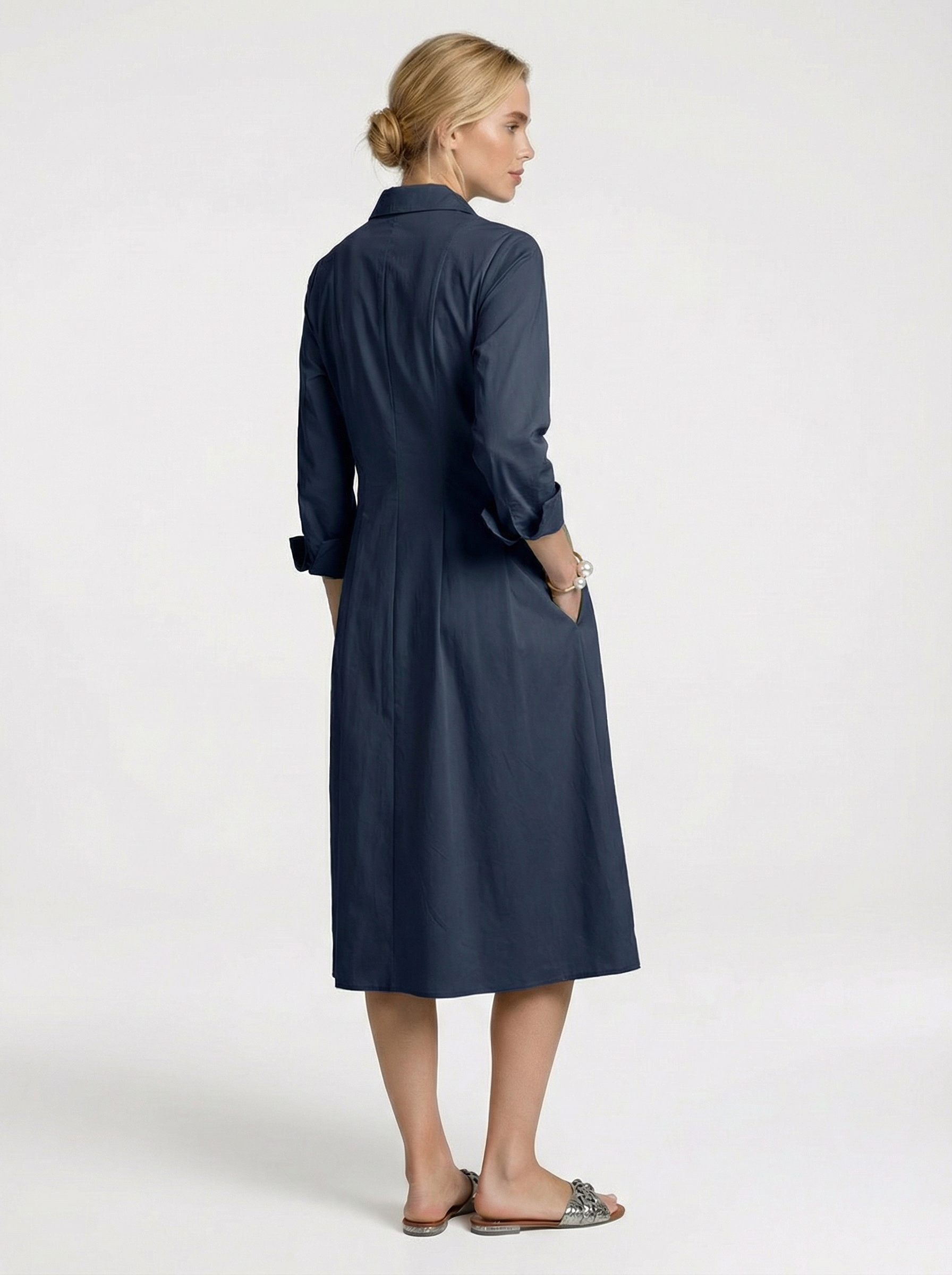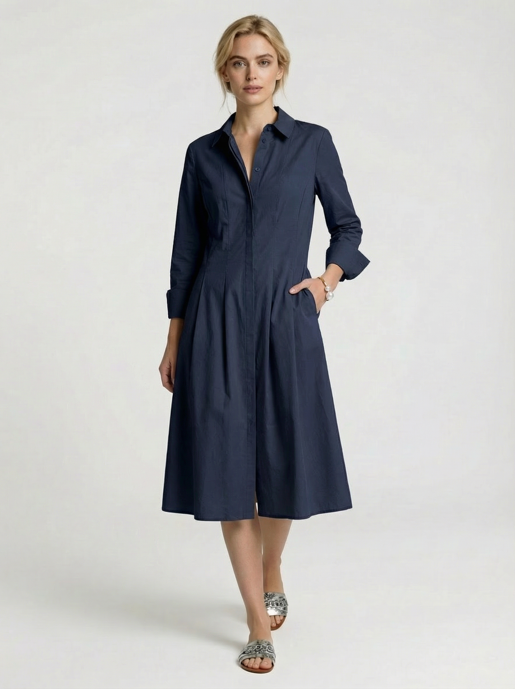 Dieses elegante, wadenlange Kleid überzeugt durch klare Linien und eine feminine Silhouette mit zeitloser Ausstrahlung. Die durchgehende, verdeckte Knopfleiste und der klassische Kentkragen verleihen dem Design eine ruhige, hochwertige Eleganz.