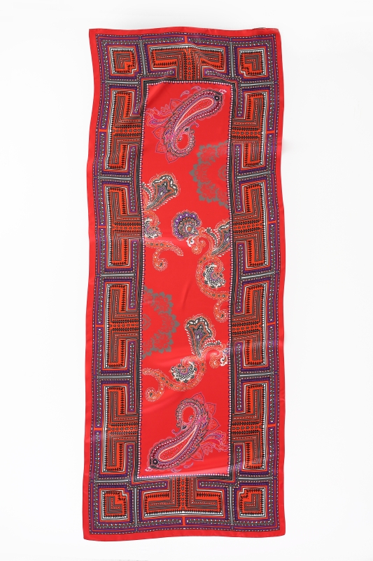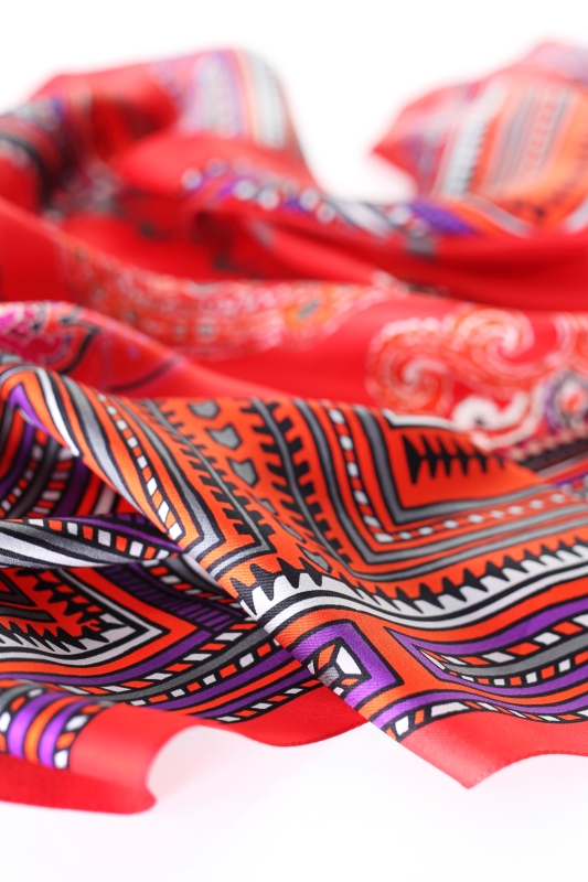 Der im Ethno- und Paisley-Muster-Mix bedruckt Seidenschal Paulina rot ist ein Blickfang für jedes Outfit.