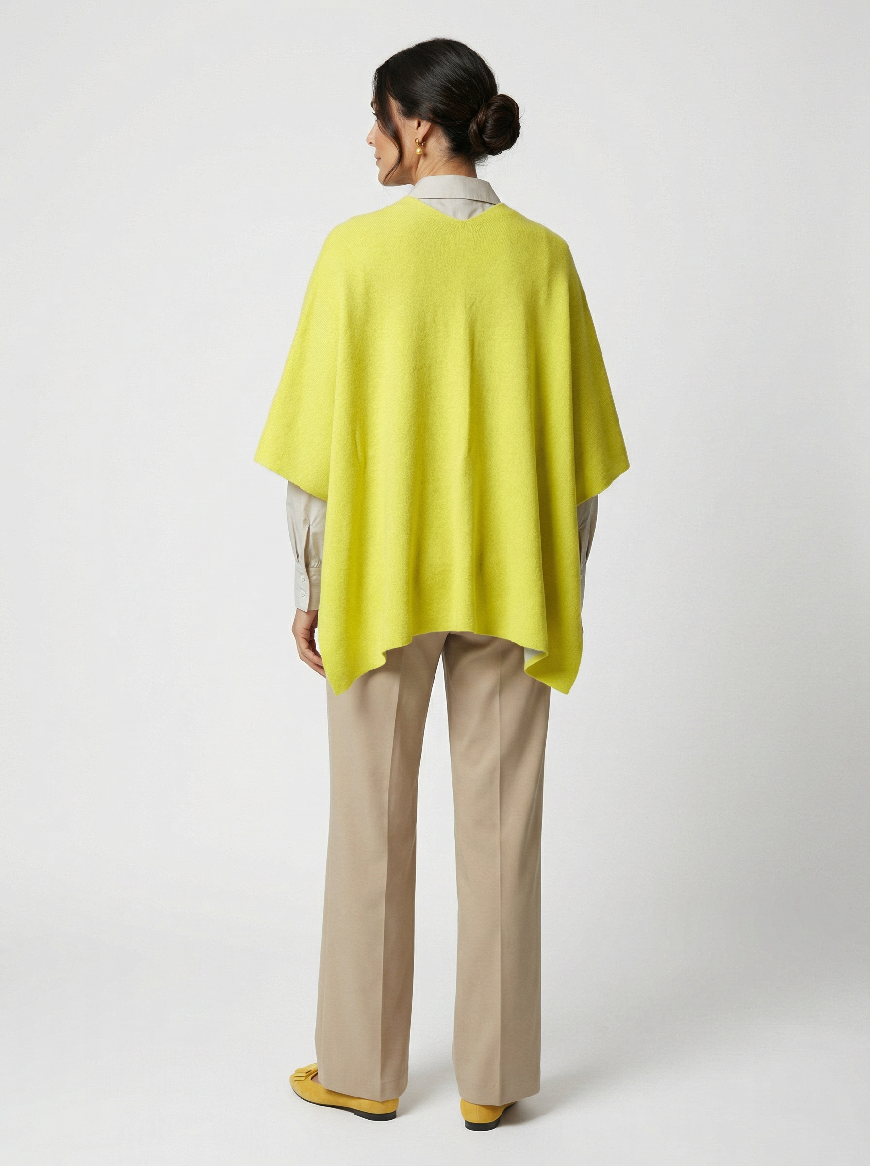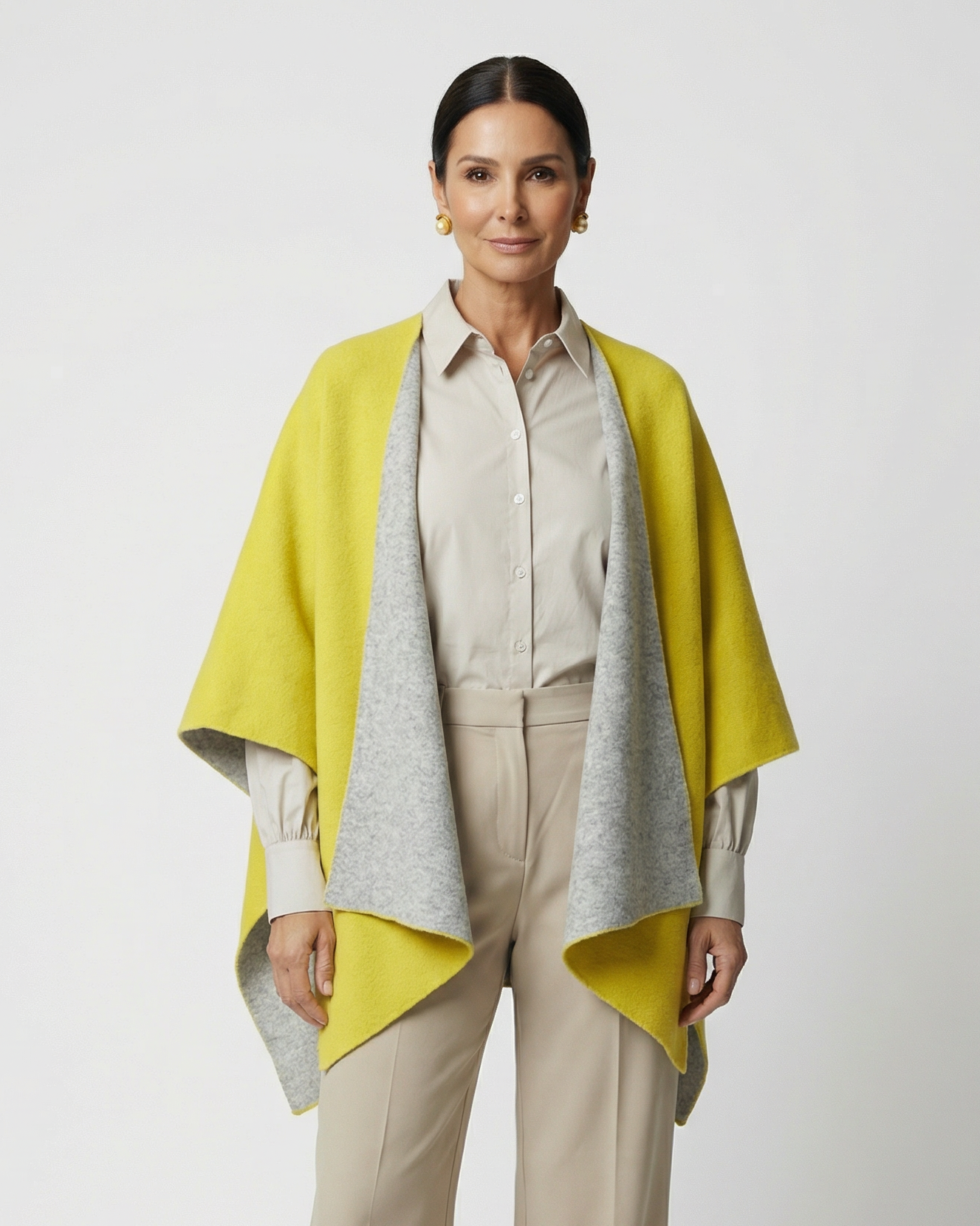 Das Cape Volterra vereint Leichtigkeit und Wärme in einer edlen Komposition. Doppelt gestrickt aus einer feinen Mischung aus Wolle, Viskose und 10 % Kaschmir, umhüllt es die Trägerin weich und geschmeidig – luxuriös im Gefühl, angenehm im Gewicht.
