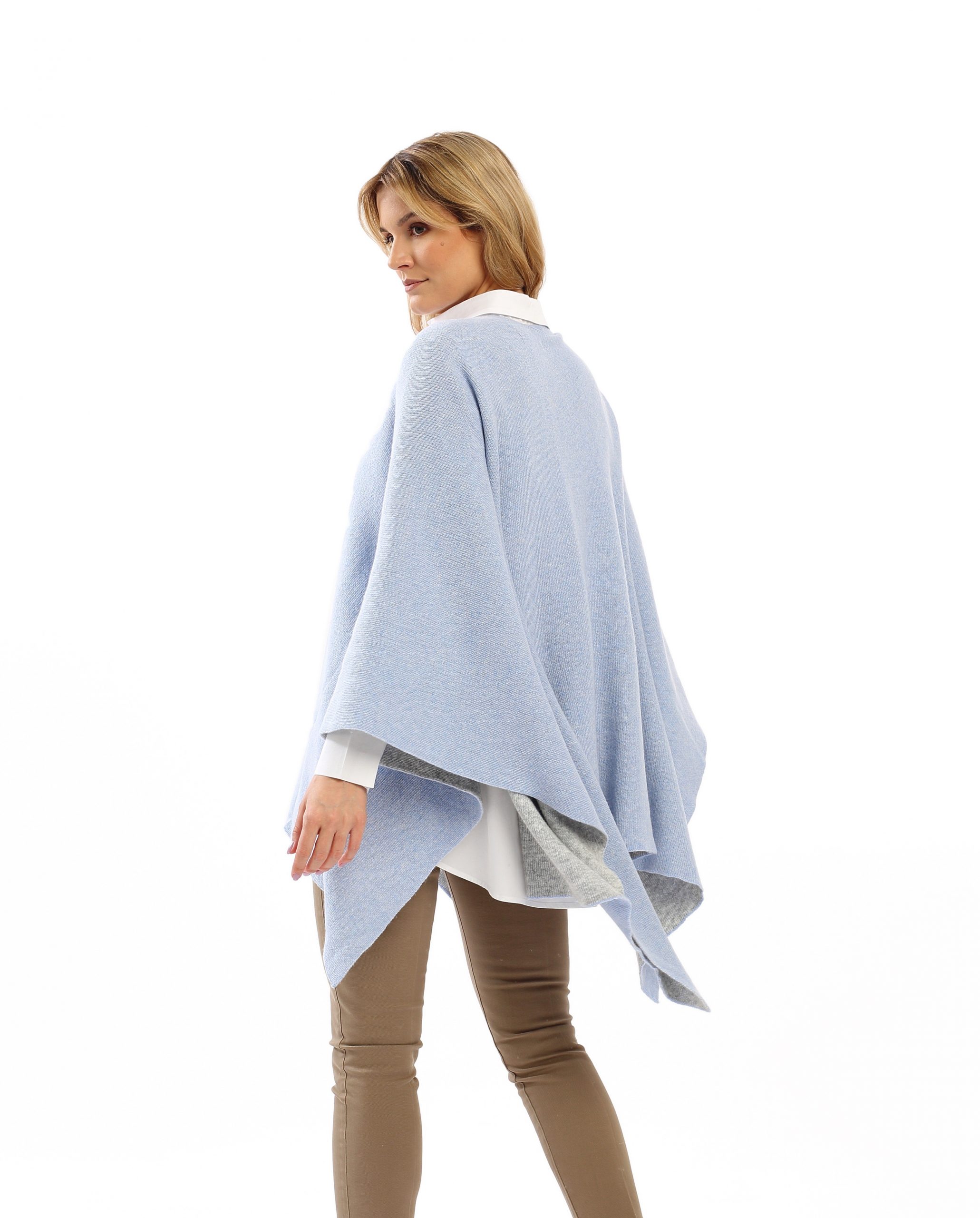 Das doppelt zweifarbig gestrickte Wollcape Volterra hellblau ist bei jedem Wetter ein modisches Highlight und trägt sich hervorragend.